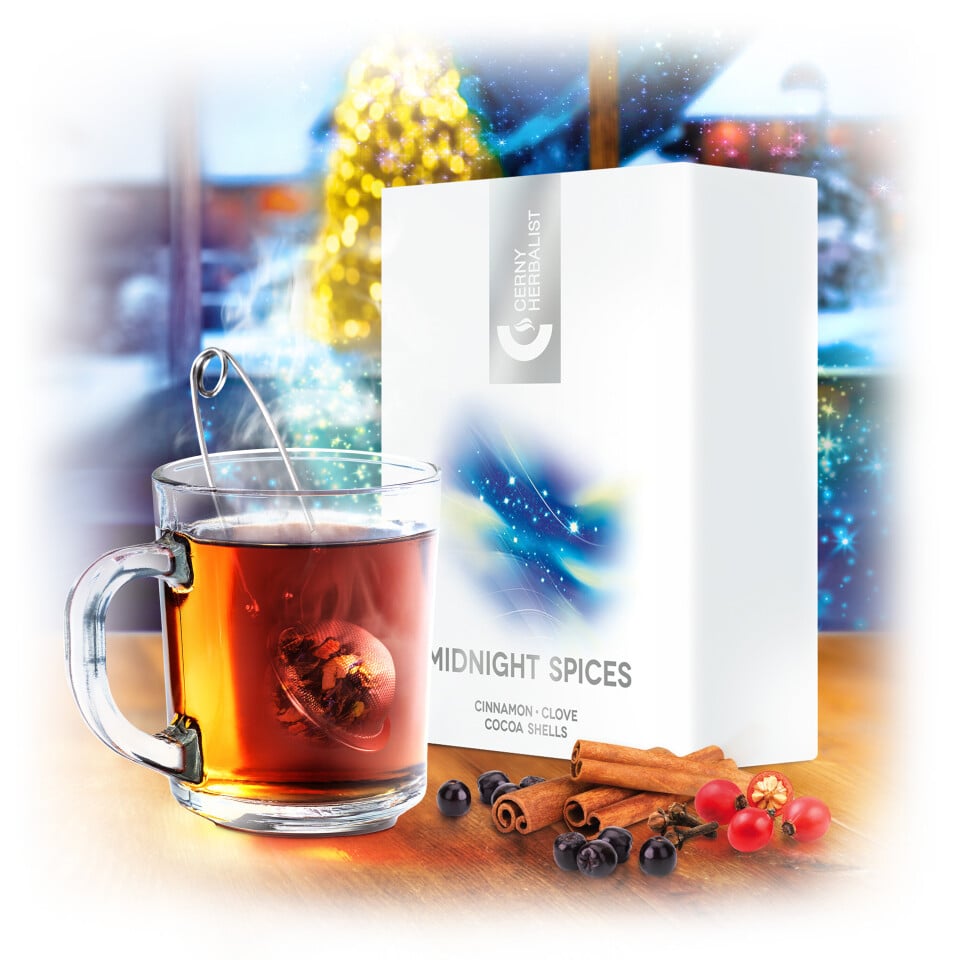 Aromatizovaná čajová směs PŮLNOČNÍ KOŘENÍ Vás zahalí do tepla domova, zatímco za okny září světélka ospalé vesničky a noc zpomaluje svůj rytmus. V dlaních držíte horký šálek, kdy vůně skořice a hřebíčku obklopuje klidnou večerní atmosféru. Sladké jablko dodává jemnost, šípek svěžest a aronie plnou ovocnou chuť. Fenykl přináší jemné bylinné tóny a kakaové slupky sametovou hloubku s teplým nádechem.