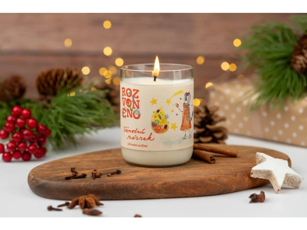 Svíčka Vánoční zázrak je vyrobena z kombinace přírodních vosků - kokosového a sójového - a je ovoněná 100% přírodními éterickými oleji - hřebíčkem, skořicí, badyánem a anýzem.