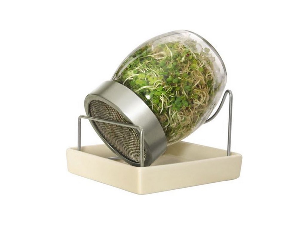 Se speciální skleněnou nádobou si během několika dní jednoduše vypěstujete perfektní klíčky. Na rozdíl od klíčení na ubrousku či vatě nemusíte mít obavu z jejich vysychání. V nádobě je pro totiž ideální vlhkost. Její víčko se síťkou z nerezové oceli zároveň umožní cirkulaci vzduchu a odkapávání přebytečné vody, takže nedojde k plesnivění. Součástí balení je také bílá keramická odkapávací miska s kovovým stojanem. Ten sklenici zajistí správný sklon pro proudění vzduchu dovnitř i odtékání přebytečné vody do misky.