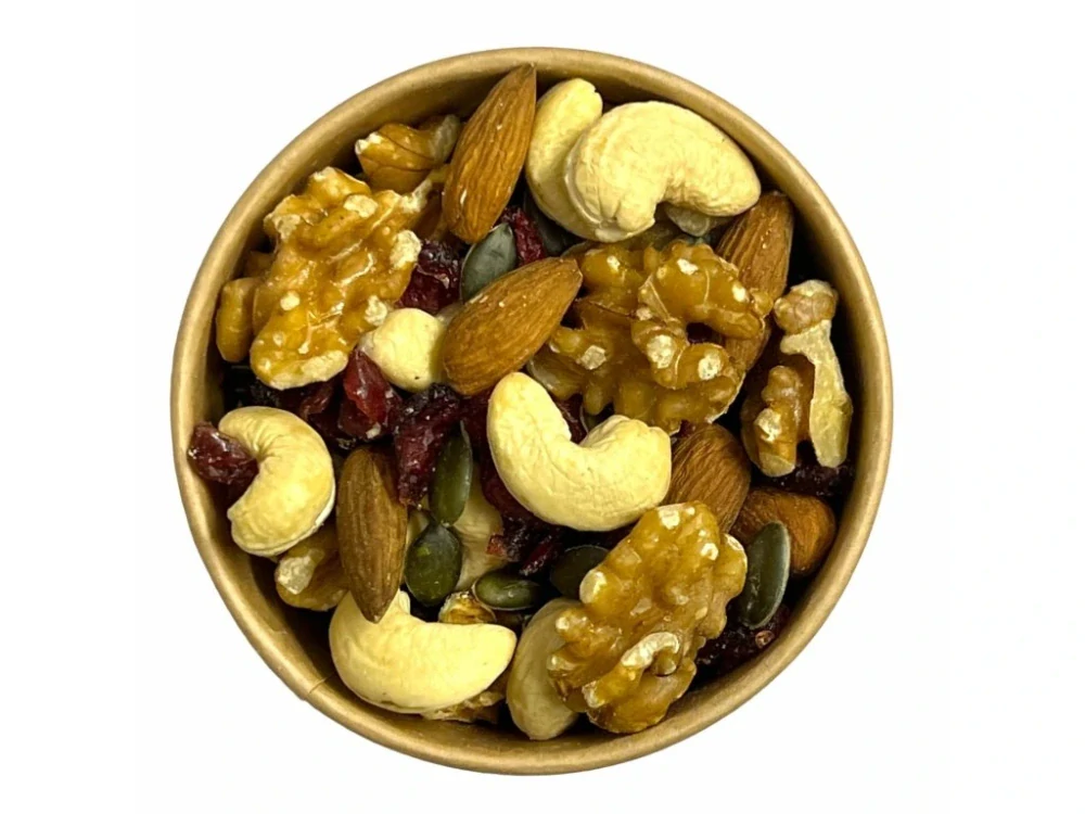 - Směs sušeného proslazeného ovoce a skořápkových plodů v proměnlivých hmotnostních podílech