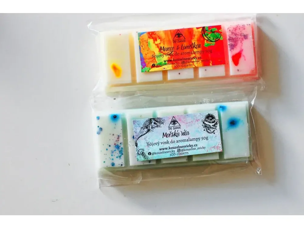 Gramáž vosku dohromady 100g - jeden obdélníček vosku vydrží vonět přes 20h tzn celkově přes 200h vůně.
