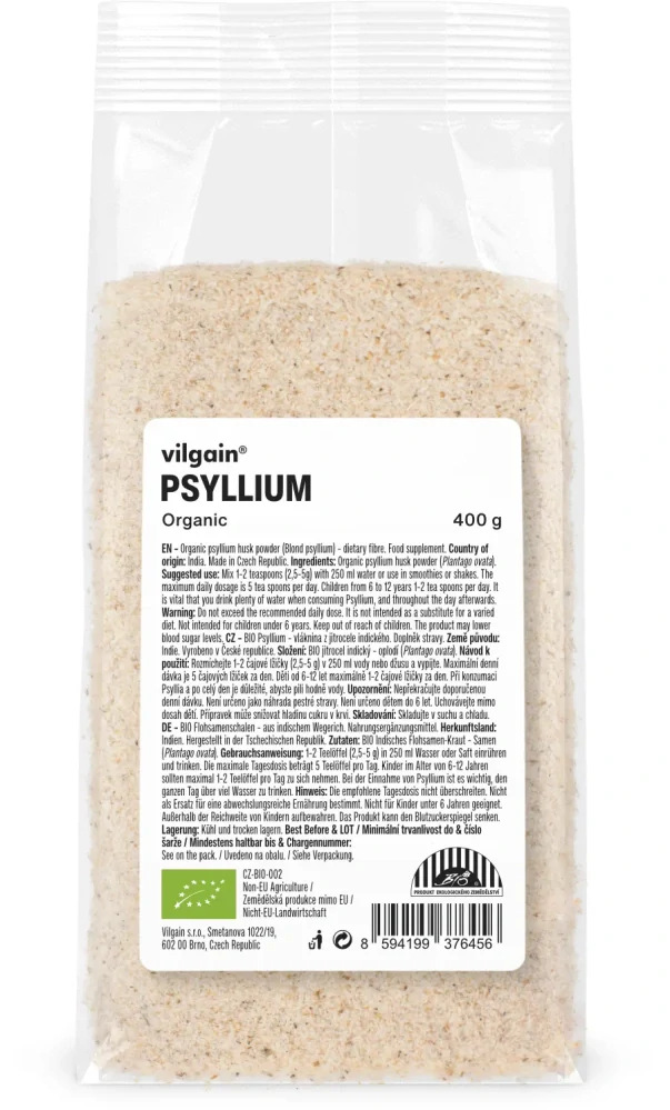 Psyllium je rozpustná vláknina, která je získána vyčištěním a následným rozemletím obalů semen jitrocele indického. Vilgain Psyllium má 98% čistotu, pochází z Indie a navíc je v BIO kvalitě.